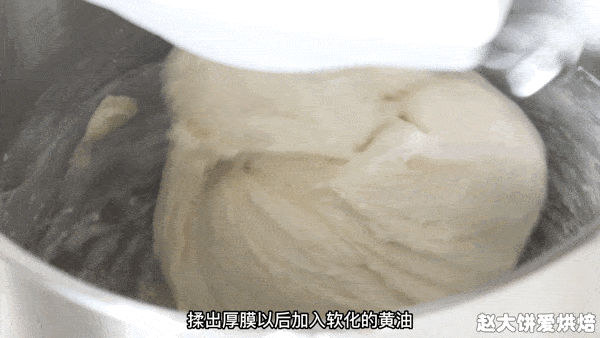 低速3檔揉面1-2分鐘,剛開始面團比較爛,吸收黃油以後,轉5-6檔揉面,面筋逐漸形成,變成光滑的面團