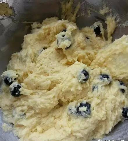 4、把幹料倒入濕料中用打蛋器攪拌均勻後,倒入洗好的藍莓(別用完),再簡單攪拌一下就好,不要過度攪拌。
