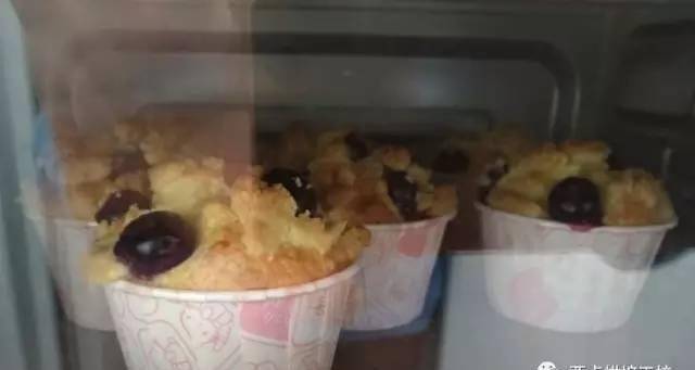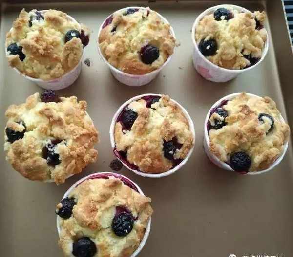5、把攪拌好的面糊均勻分到紙杯中,再把剩餘的藍莓放在上面點綴,最後把做好的金寶酥粒均勻的放在上面,然後送到烤箱180度烤20-25分鐘,或直到表面金黃,或者藍莓爆漿就可以瞭。