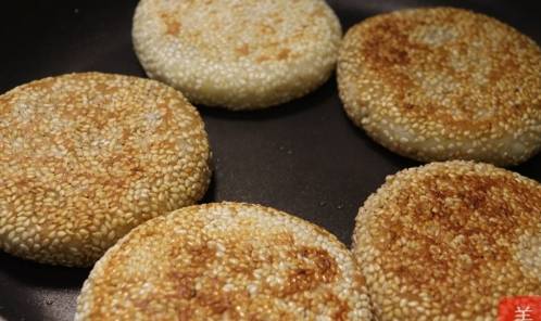 3、煎餅時要采用小火慢煎的方式,而且要不斷地對其進行翻面,讓餅受熱均勻,不然其表面的芝麻很容易就會焦糊。