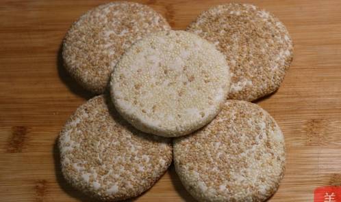 2、在制作餅胚的時候,在其表面裹上一層白芝麻,能讓做出來的餅更脆香,而且味道會更香濃哦。