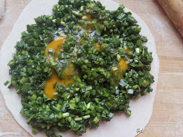 第五步:把韭菜均勻的放在面皮上,打上一個新鮮雞蛋。做韭菜盒子放生雞蛋比熟雞蛋要更鮮美。
