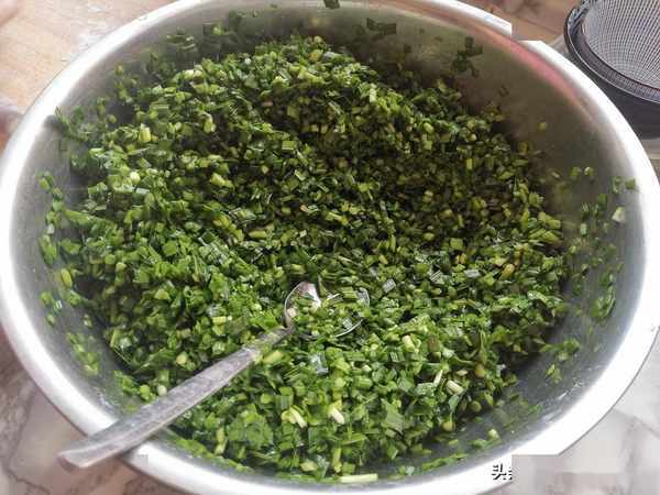 第三步:把韭菜摘洗幹凈之後,切成碎末,放到盆中,加入花生油拌勻,再加入鹽和雞精拌勻。這樣韭菜就不會很快的出水。