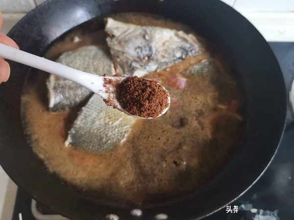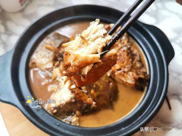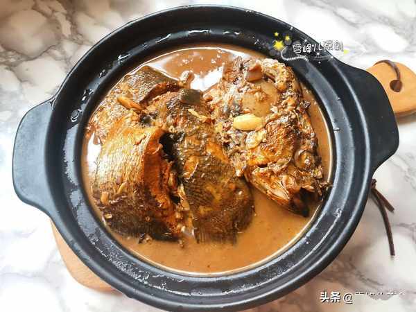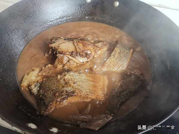 第七步:改成小火慢慢燉大約40分鐘以上,俗話說:千滾豆腐,萬滾魚。也就是說魚越燉的時間長了越好吃,口感好更入味。燉魚的時間不要太短了,那樣味道就會大打折扣。這也是燉魚好吃的原因。
