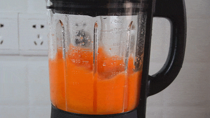 2、接著裝入破壁機中,加200克清水炸成細膩的胡蘿卜汁。