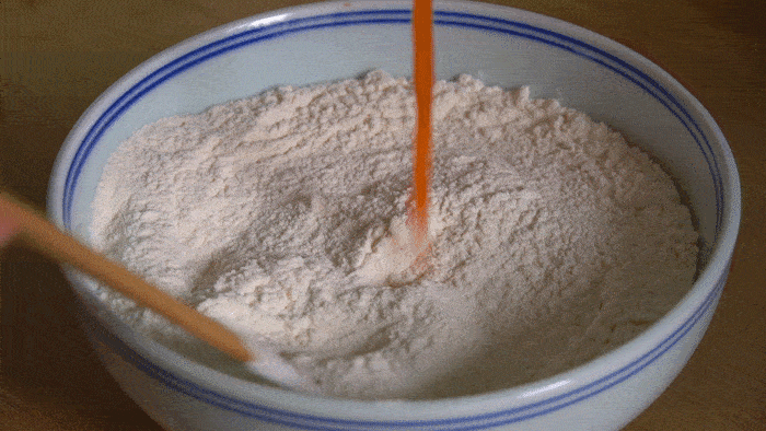 1、碗裡加400克中筋面粉,3克鹽,鹽可以增加面粉的筋性,拌勻後少量多次的加入200克胡蘿卜汁,邊加邊攪拌。
