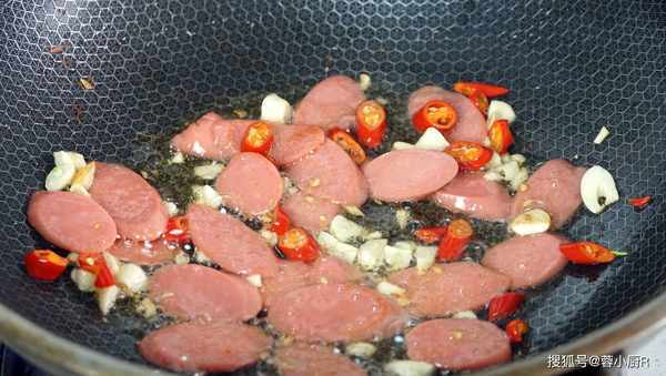 4、起鍋熱油,下蔥蒜小米椒,爆香後倒入火腿腸,先把火腿腸炒一下,炒到有點焦焦的就可以瞭。