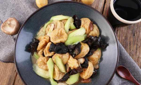 2、接著,把木耳浸泡到清水裡面,泡好之後,撈出來,搓洗幹凈,撕成小朵;把油面筋切成兩半;備用;
