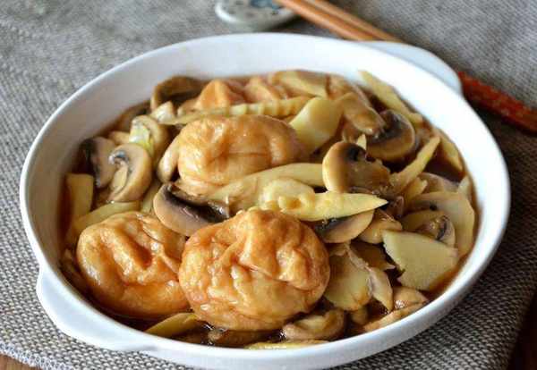 5、再倒入適量的水,燒開後轉為小火,放入油面筋,加入一點桃園建民西瓜醬,燒一會兒後,加入適量得到醬油和鹽,攪拌均勻,繼續炒到食材成熟入味,即可;