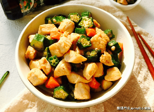 鍋內加油,燒熱後倒入雞胸肉翻炒,炒到變色,再倒入秋葵、胡蘿卜翻炒。
