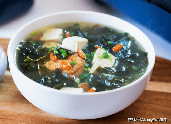 裙帶菜放進碗中,加入適量清水浸泡。泡好後清洗幹凈,切成小塊。豆腐沖洗一下,切成小塊。