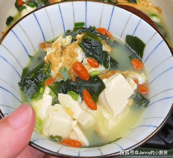 接著倒入適量開水,放入裙帶菜、豆腐,大火煮兩分鐘。