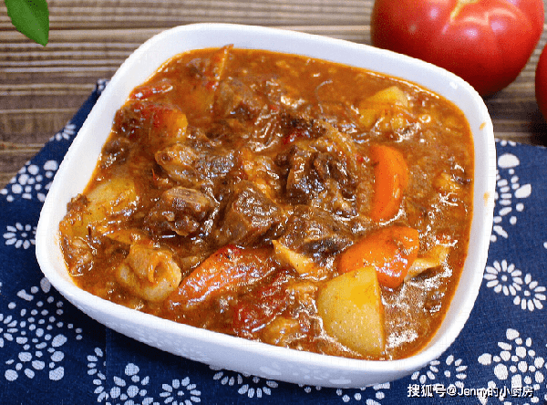 接著倒入適量番茄醬、鹽、白糖、生抽、老抽翻炒均勻,再倒入燉軟的牛肉和牛肉湯,加入土豆塊、胡蘿卜塊,繼續煮二十分鐘。