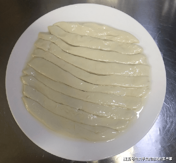 2、醒好的面團用手揉一揉,揉光滑後用搟面杖搟成5毫米厚的面餅,再用刀切成細條。細條刷上一層油,蓋上保鮮膜繼續醒面半小時,增加面條的延展性,方便抻面。