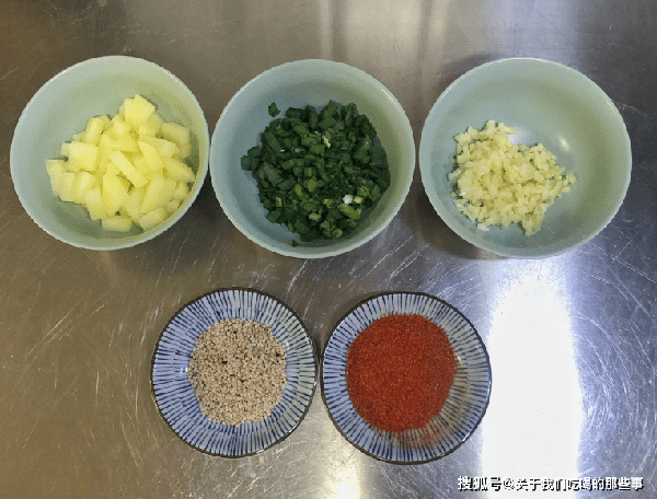 準備面粉、食鹽、生抽、香醋、香油、辣椒粉、十三香、熟白芝麻、韭菜、土豆、蒜瓣、食用油。