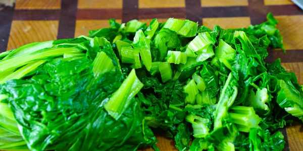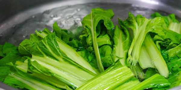 坐鍋燒水,水開後先把菜梗部分下鍋煮幾分鐘撈出來,再把菜葉下鍋煮一滾撈出來。分開焯水是因為菜梗比菜葉難熟,要是一起下鍋的話,菜梗煮熟時菜葉會煮得太爛。