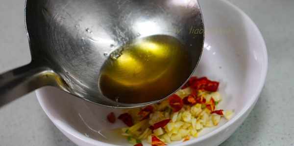 燒一勺熱油,淋在碗中,把大蒜、薑和辣椒碎激香。