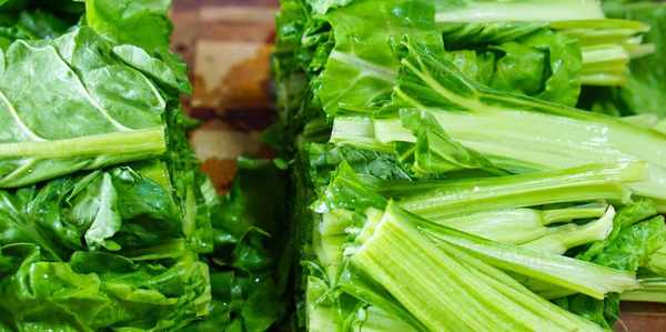 接著把牛皮菜切成兩段,菜梗和菜葉分開。