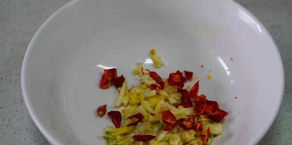 大蒜和薑切碎放在小碗中,紅辣椒用剪刀煎碎也放在碗中。