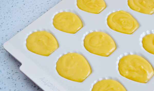 7.裱花袋剪一個小口,將面糊擠入瑪德琳模具中。