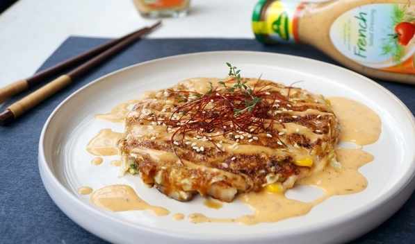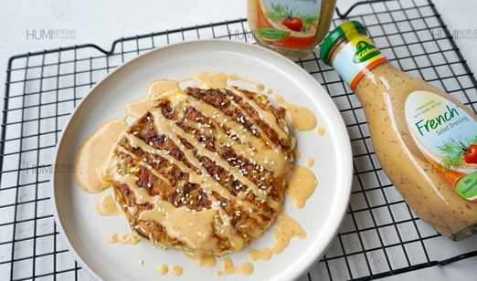 5.兩面煎至金黃,刷上燒汁,淋上沙拉醬,撒上芝麻