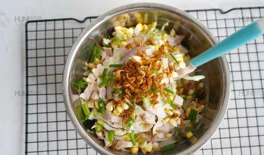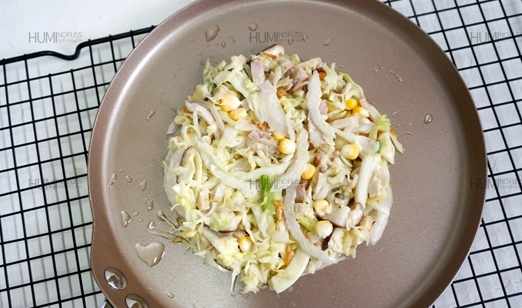 捲心菜半個、洋葱1/4個、麵粉50克、水85克、雞蛋1個、蝦米適量、葱適量、玉米粒適量、香菇適量、叉燒粒適量、精鹽適量
