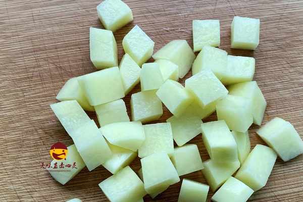 第二步,將土豆表皮的泥沙清洗幹凈,後用削皮刀削去土豆皮,然後切成土豆丁,將土豆丁放入清水中,清洗2遍,洗去土豆丁表皮的淀粉,瀝幹水分備用。#土豆#