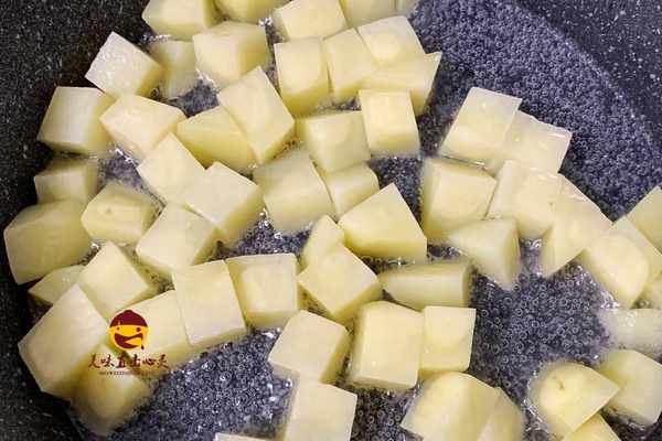 第三步:鍋清洗幹凈,燒幹水分,倒入適量的花生油燒熱,再倒入土豆丁,小火將土豆丁煎成金黃軟糯,大約煎五分鐘。