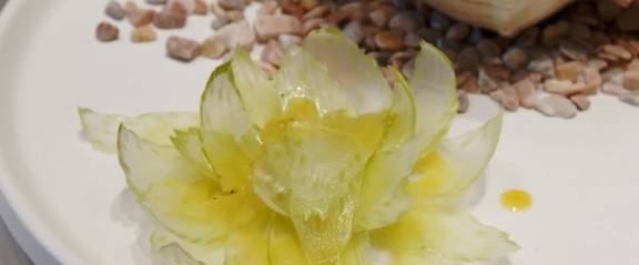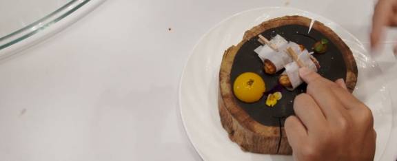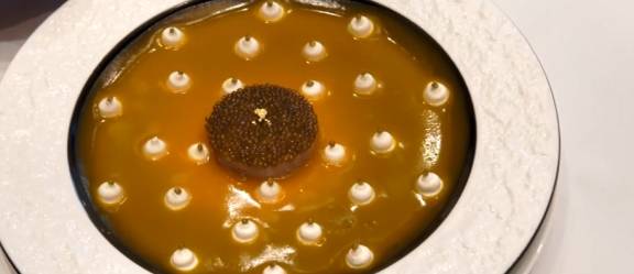 第二道就是雪梨鵝肝慕斯,也是店裡的招牌菜之一,它的話,上面是點綴食用金箔,還有雲南的魚子醬,在這邊的話,是豫南高山泉水養殖的,十到二十天然後制成的魚子醬。不得不說,這擺盤也太精美瞭吧,連盤子都是很奢華的。