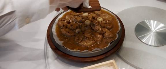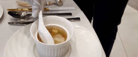 說完裝修,就要說說這傢店的出品瞭,第一道要介紹的就是豬骨燉花膠,這個湯的話,也是這裡的一大特色,它是圓盅隔水古法蒸的一個做法,蒸瞭有八個小時,裡邊的食材還是蠻足的,湯確實是很鮮,也很清爽,基本上沒有什麼油。