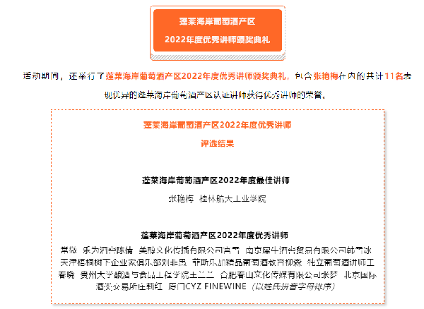 活動期間,還舉行瞭 蓬萊海岸葡萄酒產區2022年度優秀講師頒獎典禮,包含張艷梅在內的共計11名表現優異的蓬萊海岸葡萄酒產區認證講師獲得優秀講師的榮譽。