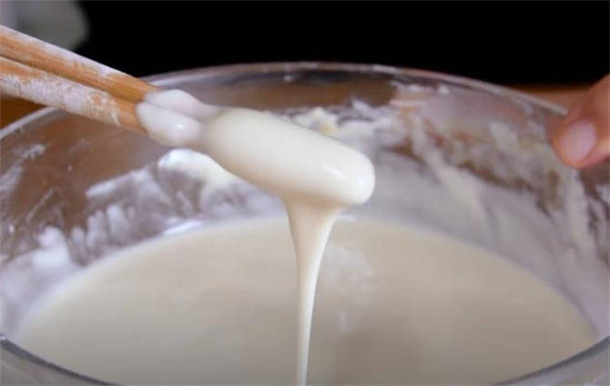 1.咱們先倒上150g的牛奶,沒牛奶的話用椰漿代替,放上30g的玉米油,30g的白糖,再來3g的無鋁泡打粉,先把這些材料都攪勻瞭,攪勻之後加上160g的糯米粉,最後咱們攪拌好的狀態,就是這樣順滑又拉絲的。