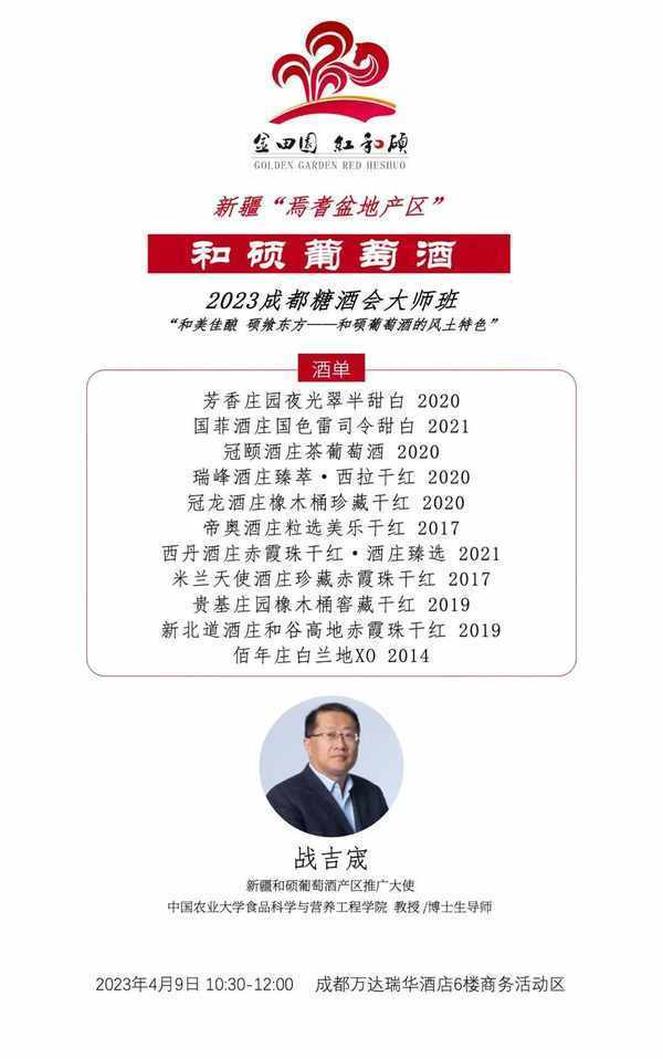 4月9日10:30-12:00,成都萬達瑞華酒店6樓商務活動區,中國農業大學食品科學與營養工程學院教授 /博士生導師戰吉宬為大傢奉上一場“和美佳釀 碩饗東方——和碩葡萄酒的風土特色”主題品鑒會,選取11款獨具新疆焉耆盆地產區和碩葡萄酒代表性的酒款,帶領大傢一起解密和碩葡萄酒風土密碼,感受和碩葡萄酒的風土特色。