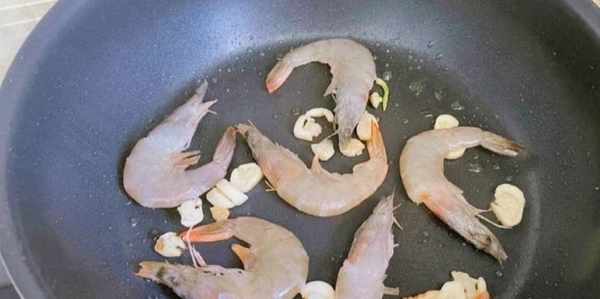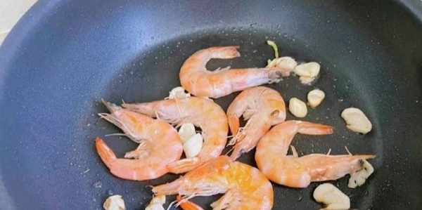 鍋中加入少量食用油,先放入蒜片,爆香後放入蝦,煎至變色