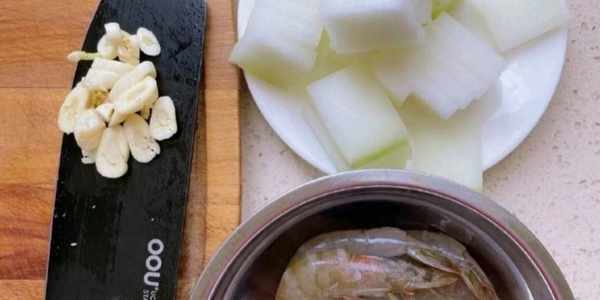 冬瓜清洗後切片,大蝦去蝦線,剪蝦須,再準備一些蒜切片