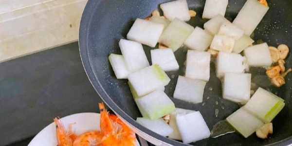 撈出蝦,用剩餘的油炒冬瓜片,加入少許鹽炒2分鐘