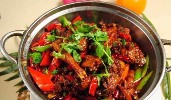 炒笨雞是山東名吃,是一道經典的傳統名肴。它的選料嚴格,必須是4年以上的老笨雞,葱、幹辣椒、花椒、鹽等多種輔料精心製作而成。成菜的菜色棕紅油亮,吃著麻辣味濃、鹹鮮醇香、營養豐富、味道鮮美。