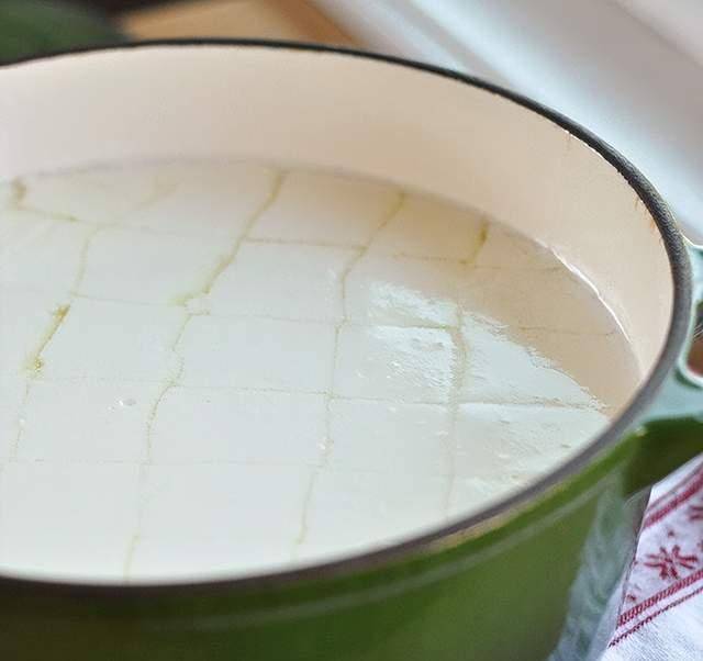 4、靜置後,牛奶應該會結塊,看起來像光滑柔軟的豆腐一樣。如果還是水水的,把鍋蓋蓋上再靜置5分鐘。等到牛奶凝固,可以先縱切再橫切,切成棋盤格般的塊狀,過程中要註意刀子有沒有確實把最底下的凝乳劃開。