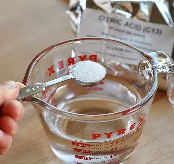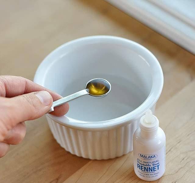 1、在一杯量的水裡倒入檸檬酸拌勻溶解。在碗中另外倒入1/4杯水,拌入凝乳酶直至溶解。