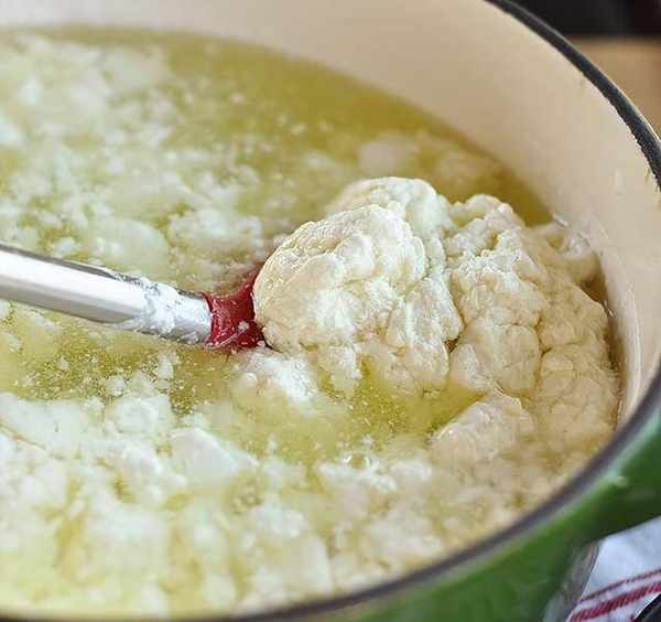 5、把鍋子放回瓦斯爐上以中火加熱至華氏105度(約攝氏40.5度),過程中緩慢攪拌,但別把凝乳打太碎。這麼做可以幫凝乳結塊,並和乳清分離。