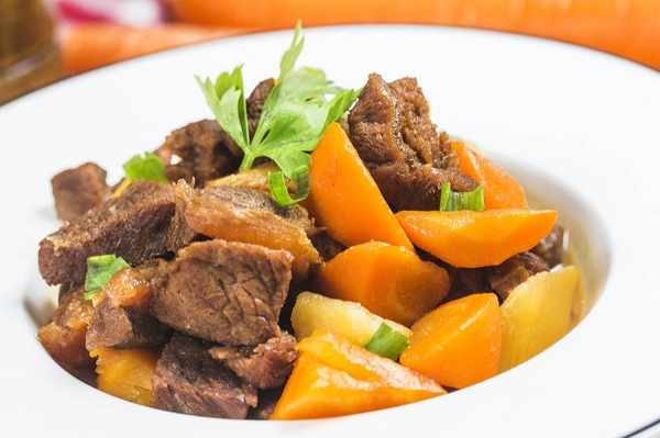 3、大火將鍋燒熱,加入花生油,燒至八成熟後將羊肉、胡蘿卜、生薑、橘皮一起放入鍋中炒勻加水,滾後改小火燜至羊肉熟爛即可食用