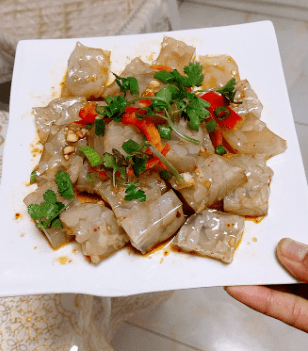 將豬皮凍切成薄片,配上些許蔥花和醬油,味道清淡爽口。