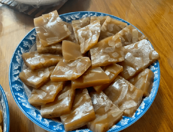 將豬皮凍切成塊,與火腿、木耳等一起煮熱,口感豐富多樣,食欲倍增。