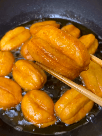 5、在平底鍋中倒入適量食用油,燒熱後將油條放入炸至金黃色,撈出瀝油即可。