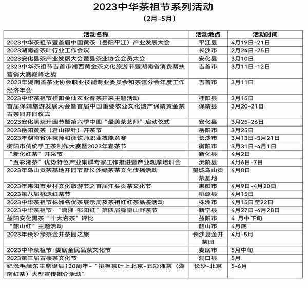 據悉,在2023中華茶祖節品茗思祖活動月期間,全省相關市州、縣市區先後還將舉行20多場茶事、茶文化系列活動,中華茶祖節活動結束後,還將舉辦“紀念毛澤東誕辰130周年‘挑擔茶葉上北京’大型獻禮活動,第十五屆湖南茶業博覽會,將組織全省茶葉龍頭企業、湖南紅茶企業代表參加農業部在杭州舉辦的第五屆中國國際茶葉博覽會以及香港美食節國際茶展、馬來西亞食品展、俄羅斯莫斯科國際食品展和濟南、北京、廣東、上海、沈陽等地的茶業博覽會以及一系列大型茶事活動。