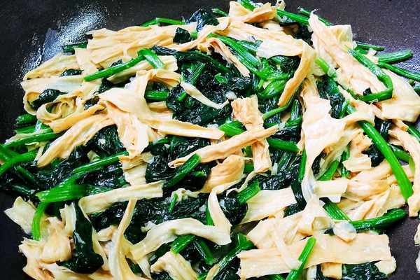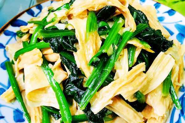 現在正值菠菜大量上市的季節,菠菜屬春秋兩季最適宜,口感鮮美可以適當多吃些。搭配幹腐竹的話,可以起到互相借味營養相配的效果。製作這一道菜肴,只需要非常簡單的調味,腐竹提前泡發好,和菠菜先分開來炒一炒,炒好之後放到一起拌一拌,製作過程幾分鐘,簡單操作易上手。