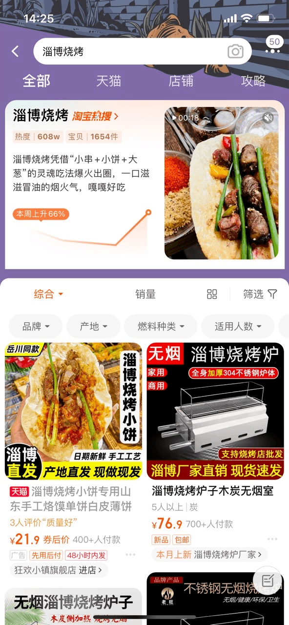 除瞭去當地品嘗燒烤,很多消費者紛紛湧入淘寶搜索周邊。近兩周,淘寶上淄博燒烤“靈魂伴侶”卷餅、蘸料等搜索量相比一個月前暴漲3000%,沖上淘寶熱搜。