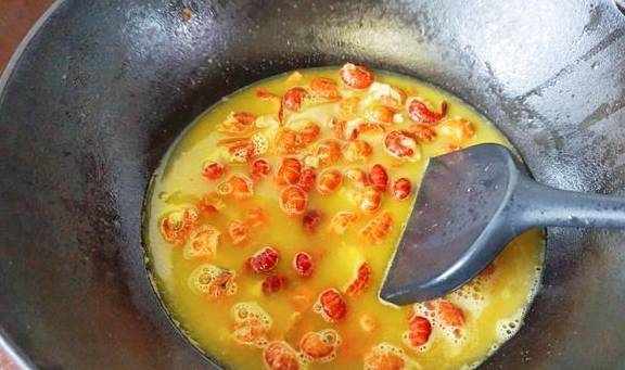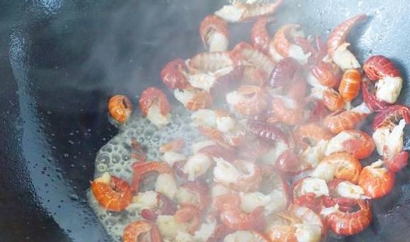 4、鍋裡熱油後放入洗凈的小龍蝦尾翻炒至小龍蝦收水變色