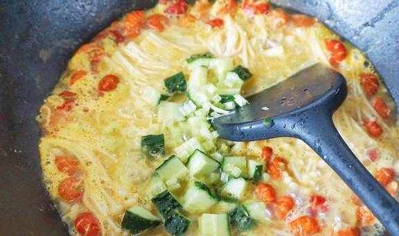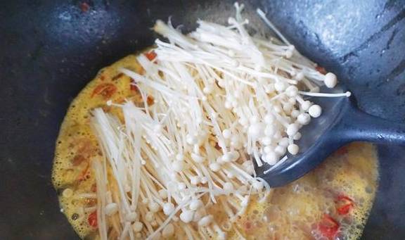 8、加入洗凈去根部的金針菇煮至湯汁再次沸騰