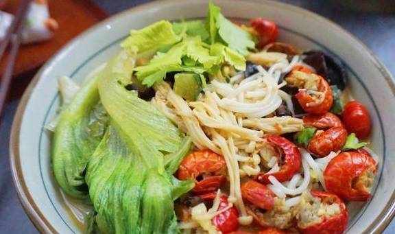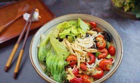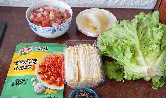 【金湯菌菇小龍蝦粉湯】小龍蝦1斤,傢樂金湯蒜蓉小龍蝦醬料1/3包,金針菇半個,木耳20克,生菜半個,植物油30毫升,西紅柿1個,黃瓜半根,芹菜1根,清水適量